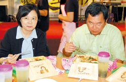 民進(jìn)黨主席蔡英文(左)吃著印有自己肖像的便當(dāng)時,忍不住欣喜滿足,一旁的嘉義縣長陳明文也津津有味地品嘗。