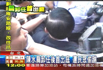 據(jù)“中央社”報(bào)道,陳水扁上午因出庭,在步入臺(tái)北地方法院時(shí),遭“愛國(guó)同心會(huì)”成員蘇安生突襲伸腿踹了一腳。蘇安生隨即被現(xiàn)場(chǎng)臺(tái)北市警方逮捕;訊后將依違反臺(tái)“社會(huì)秩序維護(hù)法”法辦。