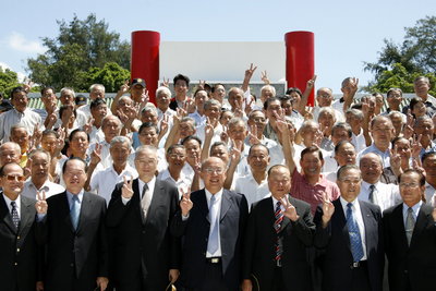 紀(jì)念“八•二三”炮戰(zhàn)五十周年,吳伯雄(前排中)18日到金門參加相關(guān)活動。(“中央社”圖)