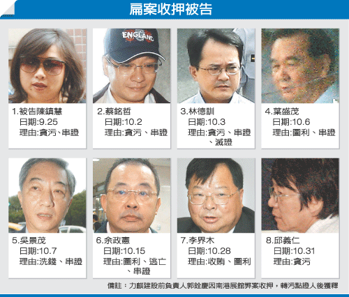 目前陳水扁弊案中,最早被收押的是卷入陳水扁家庭洗錢疑案的力麒建設(shè)公司負(fù)責(zé)人郭銓慶,他在9月12日,就因被臺北地檢署查出另涉世貿(mào)南港展覽館興建工程行賄標(biāo)案評選委員弊案,檢察官傳喚他到案,向臺北地方法院聲請羈押禁見獲準(zhǔn)。
