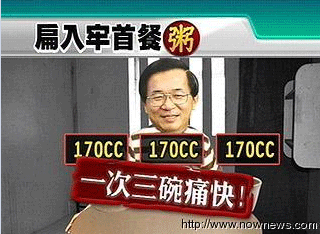 中新網(wǎng)11月28日電 據(jù)臺(tái)灣“今日新聞”報(bào)道,身陷洗錢疑云的陳水扁遭收押后即以禁食抗議,不過(guò),昨天(27日)晚間已恢復(fù)進(jìn)食,不但喝了500毫升的粥,還吃了一顆水煮蛋。國(guó)民黨“立委”邱毅諷陳水扁說(shuō),別一口氣吃太多,以免“瀉肚”。