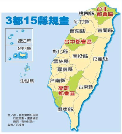 據(jù)稱,“三都十五縣”的三都是:臺北都會(huì)區(qū)(臺北市、縣、基隆市,民國一○三年合并)、臺中都會(huì)區(qū)(臺中市、縣,九十九年合并)、高雄都會(huì)區(qū)(高雄市、縣,南部縣市長爭取一百年合并)。十五縣是:桃園、新竹(新竹市、縣)、苗栗、彰化、南投、云林、嘉義(嘉義市、縣)、臺南(臺南市、縣)、屏東、宜蘭、花蓮、臺東、澎湖、金門、連江。