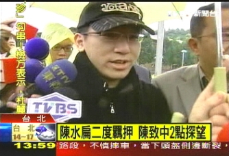 中新網(wǎng)12月30日電 據(jù)臺灣TVBS報道,陳水扁第二度遭到羈押,由于沒有禁見,他的兒子陳致中在今天下午兩點到臺北看守所探視。