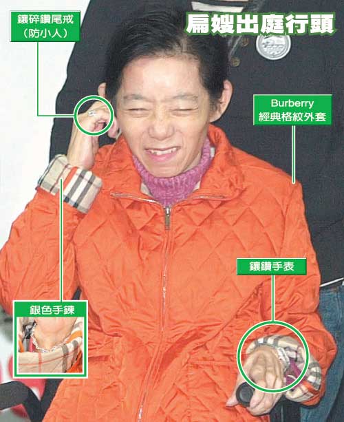 吳淑珍出庭現(xiàn)身,一件亮橘色的外套,讓她看起來氣色很好。這件鋪棉外套是吳淑珍最愛的英國(guó)名牌Burberry熱賣款,一件要價(jià)25000元;另外,雖然沒有滿身珠光寶氣,但看她揮手致意,右手小指戴了1克拉鉆石,這只防小人的尾戒也要大約60萬。