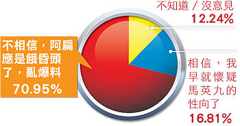 除此之外,臺灣《蘋果日報》還做了民意調(diào)查,結(jié)果顯示,70.95%的臺灣受訪民眾認為關(guān)于馬英九同性戀的說法是陳水扁餓昏了頭亂爆料,只有16.81的民眾表示相信此事。(韋博)