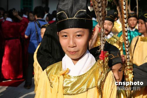 晨六時,天放亮,“鼓三嚴(yán)”,祭典依舊制開始。著褐色古袍的引領(lǐng)人員引領(lǐng)“主獻官”臺北市長郝龍斌及“分獻官”、“陪祭官”等入場,郝龍斌及作為“分獻官”、“陪祭官”的十幾位臺北優(yōu)秀教師和各界代表,著藍(lán)色長袍,黑色馬褂,依次走向固定位置佇立。