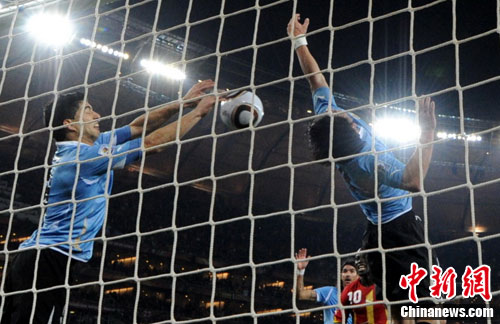 第120分鐘,加納隊覓得最有威脅的一次攻勢。任意球開出后加納隊頭球攻門被門將擋出,再次頭球攻門被蘇亞雷斯在禁區(qū)線上用一個排球攔網的動作將球擋出。點球+紅牌!加納隊迎來了終結比賽的機會。