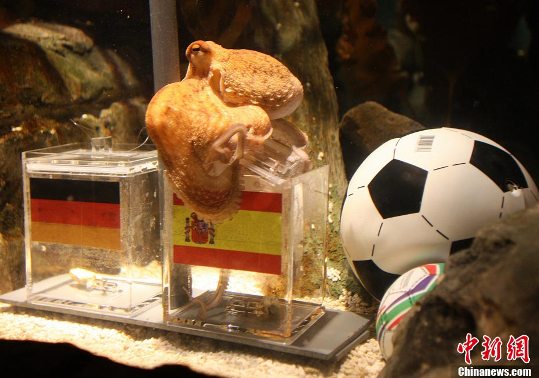 在當?shù)貢r間6日,德國奧博豪森一家海洋館的章魚保羅再次出陣,預測西班牙與德國的這場世界杯半決賽的勝負。此前,因為它已經成功預測德國隊世界杯前5場的比賽,而讓眾多德國人乃至世界范圍的球迷成為其信徒,認為它才是這個星球上的“真相帝”。