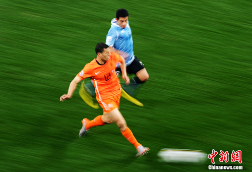 中新網(wǎng)7月7日電 今天凌晨2:30,南非世界杯半決賽首場較量在開普敦綠點球場拉開戰(zhàn)幕,由南美老牌勁旅烏拉圭迎戰(zhàn)荷蘭隊。布隆克霍斯特遠(yuǎn)射先拔頭籌,而弗蘭也通過一記遠(yuǎn)射將比分扳平。下半場斯內(nèi)德和羅本連續(xù)進球一度令荷蘭隊鎖定勝局,然而補時階段烏拉圭人的進球似乎又燃起了最后的希望,但荷蘭隊頂住了對手的瘋狂進攻,3-2擊敗烏拉圭隊,成功挺進決賽。
