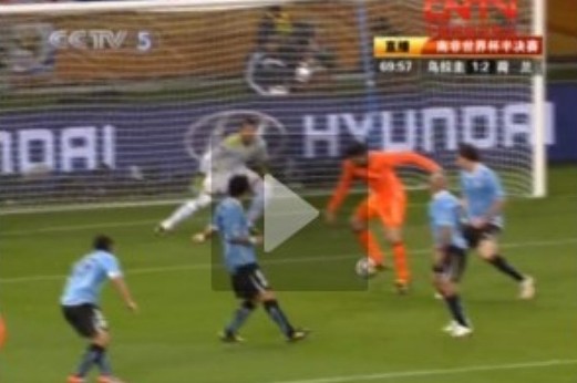 比賽進行到第70分鐘,荷蘭隊中場大將斯內(nèi)德在禁區(qū)左側(cè)遠射攻門,皮球擦著草皮躥向烏拉圭隊的球門,不過,處于越位位置的荷蘭隊前鋒范佩西將球一讓,皮球直接進入了烏拉圭隊的大門。憑借著這個進球,荷蘭隊2比1將比分再次超出。3分鐘后,荷蘭隊利用烏拉圭隊失球后心態(tài)出現(xiàn)問題,由羅本再入一球,鎖定勝局。