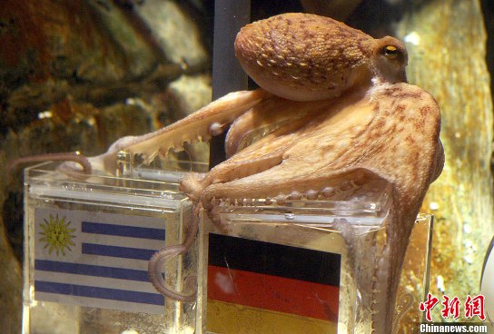章魚“保羅”絕對是本屆世界杯賽的大明星,對德國隊(duì)的比賽的競猜他已經(jīng)是屢試不爽。除了兩年前尚處在幼年的它對歐洲杯預(yù)測6中其5,猜錯(cuò)了決賽外,其他的比賽,包括本屆世界杯賽,它猜中了13場比賽中的12場!