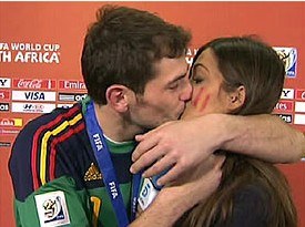 西班牙在首戰(zhàn)對(duì)陣瑞士的小組賽中被中場(chǎng)費(fèi)南德斯攻進(jìn)一球,卡西利亞斯撲救不及,讓西班牙最后輸?shù)舯荣。?dāng)時(shí),卡西的美艷記者女友卡波內(nèi)羅就站在球門(mén)后。她在賽后現(xiàn)場(chǎng)報(bào)導(dǎo)時(shí)毫不客氣地質(zhì)問(wèn)男友:“你是怎么把比賽搞砸的?”