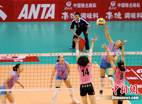 中新網(wǎng)漯河8月1日電 (記者 師紅壘 通訊員 林波)7月31日上午,2010年全國女排錦標(biāo)賽(雙匯賽區(qū))在漯河市體育中心體育館進(jìn)行了交叉賽的4場較量,東道主河南隊0:3不敵缺席多名國手的全國女排聯(lián)賽七冠王天津隊,江蘇3:0戰(zhàn)勝遼寧,山東3:1擊敗云南,廣東0:3負(fù)于河北。四場比賽的具體比分是:天津-河南(25:16、25:16、25:11);江蘇-遼寧(25:21、27:25、25:18);山東-云南(25:21、20:25、25:19、25:21);廣東-河北(8:25、23:25、12:25)。