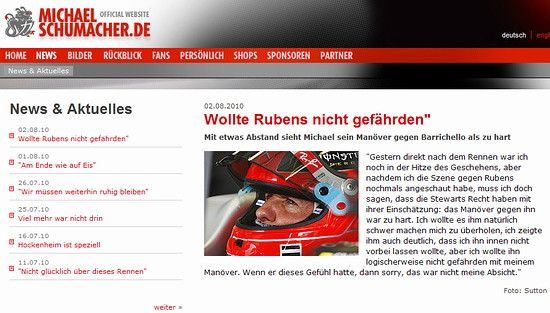 舒馬赫在官網(wǎng)上稱:“再次看過我與魯本斯之間的錄像后,我覺得干事的處罰是正確的。那種強硬的防守確實太過分了。我沒有發(fā)覺我的動作帶給他的危險。如果他這么覺得,那么我要說:對不起,我不是故意的!