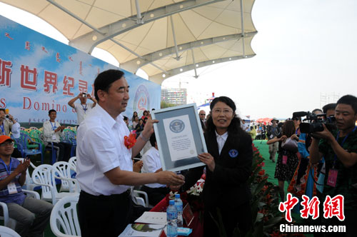 今天的活動(dòng)打破了新加坡在2000年9月30日由9234名學(xué)生在圣陶沙島西樂(lè)索海灘創(chuàng)造的人體多米諾吉尼斯世界紀(jì)錄。經(jīng)過(guò)最終的檢查和確認(rèn)后,新的紀(jì)錄正式生效,吉尼斯世界紀(jì)錄認(rèn)證官吳曉紅向鄂爾多斯市長(zhǎng)云光中頒發(fā)了吉尼斯世界紀(jì)錄證書(shū)。