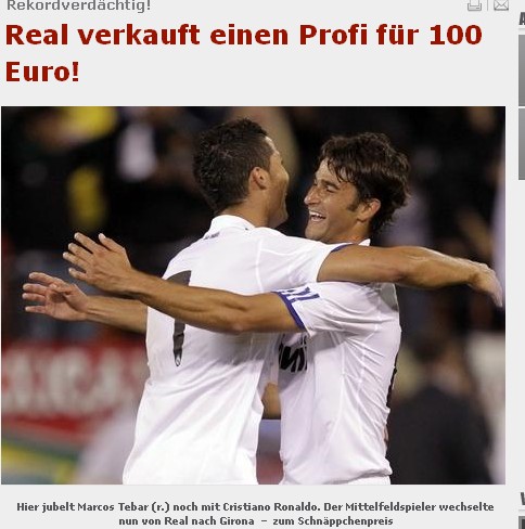 繼去年收購(gòu)C羅花掉9400萬(wàn)歐元?jiǎng)?chuàng)下世界足球歷史最高轉(zhuǎn)會(huì)費(fèi)紀(jì)錄之后,皇馬有望再次創(chuàng)造歷史。預(yù)備隊(duì)、現(xiàn)丙級(jí)聯(lián)賽球隊(duì)皇馬卡斯蒂亞隊(duì)球員馬克斯-特巴爾將以100歐元的價(jià)格被賣到西乙球隊(duì)赫羅納,圖片報(bào)稱,100歐元的轉(zhuǎn)會(huì)費(fèi)有可能成為世界職業(yè)足壇歷史最低身價(jià)。