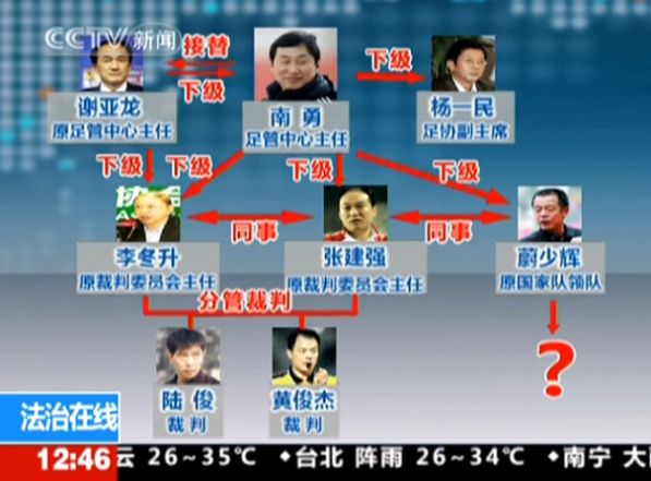 中新網(wǎng)9月13日電 自上周末公安部證實(shí)前謝亞龍、李冬升和蔚少輝已被立案?jìng)刹橹螅袊?guó)足協(xié)已有多人被抓。中央電視臺(tái)在今天的新聞節(jié)目中,解析了“足協(xié)高官涉案”的“關(guān)系網(wǎng)”。