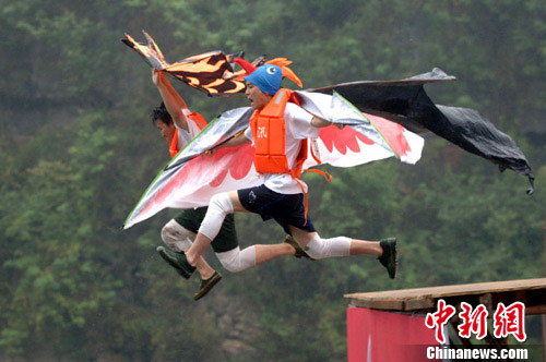 記者在現(xiàn)場看到,來自中國各地的6名鳥人跳水愛好者參加了今天的首跳儀式。水上拓展區(qū)周圍,放著20多副“鳥人”翅膀,有的像老鷹的翅膀,有的像大風箏,有的做成汽車模樣,有的像仙女服裝,有的干脆用幾把普通的雨傘扎成,可謂千奇百怪,各具特色。6名鳥人愛好者依次走上5米高的跳臺,用各種姿勢往下跳。有的騰空躍起,再緩緩下落、有的來一個前空翻再落入水中、有的在空中連翻幾個筋斗直入水中、有的作仰睡狀背先落水,鳥人跳水的怪模樣引得眾多觀眾哈哈大笑。