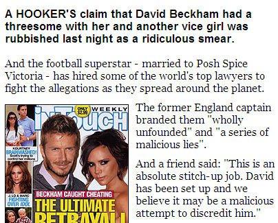 對此,貝克漢姆召集了自己的法律團(tuán)隊(duì),決定采取法律還擊,他憤怒的稱該妓女的言辭完全沒有根據(jù),是一系列的謊言。而傳播這一流言的雜志也將被告上法庭。小貝的一個朋友說:“這絕對是一個陷阱,有人想借小貝出名,并想令他名譽(yù)掃地!