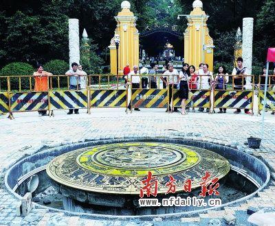 據(jù)介紹,原點(diǎn)標(biāo)志表面微凸,高出地面15厘米,直徑3米。標(biāo)志物外圍采用灰、黑兩色花崗巖作襯邊,沿放射線方向鑲嵌銅條,花崗巖表面陰刻了廣州建城歷史簡(jiǎn)記。內(nèi)側(cè)圓盤(pán)采用2厘米厚的黃銅板和巴西水晶石制成,重達(dá)3噸,圖案取材于南越王墓出土的“龍鳳玉佩”和“羽人駕舟”浮雕圖案,彰顯了嶺南文化特色。