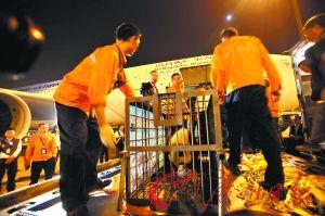 廣州日?qǐng)?bào)10月28日?qǐng)?bào)道 23時(shí)58分,第一批兩只熊貓寶寶津柯和博斯同時(shí)被運(yùn)下飛機(jī),2分鐘后就被裝上了前來(lái)迎接它們的車輛。其余4只熊貓?jiān)诘诙黄鹣铝孙w機(jī),所有熊貓寶寶在今日凌晨0時(shí)10分裝車完成,被送往香江野生動(dòng)物園。