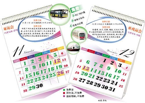根據(jù)相關(guān)規(guī)定,在亞運(yùn)會(huì)及亞殘運(yùn)會(huì)機(jī)動(dòng)車(chē)單雙號(hào)限行的46天里(11月1日至29日、12月5日至21日),剔除13個(gè)雙休日和3天新增假期后的30個(gè)工作日里,市民都可免費(fèi)享受公共交通服務(wù)。有關(guān)部門(mén)預(yù)計(jì),免費(fèi)期間廣州每天將新增300萬(wàn)人次的客流,高峰期可能出現(xiàn)“井噴”,請(qǐng)沒(méi)有剛性出行需求的市民注意錯(cuò)峰出行。
