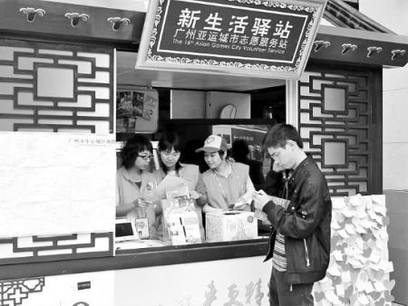 昨天下午當(dāng)班的黃洪丹,是廣東交通職業(yè)學(xué)院的大二學(xué)生,也是同行8人的班長。她為記者一一介紹了站內(nèi)各種方便設(shè)施,告訴記者今天短短幾個小時,她們已經(jīng)接待了100多位前來咨詢的朋友,“就是剛才,我們剛給一大幫外國朋友指了去亞運(yùn)村的路呢。”