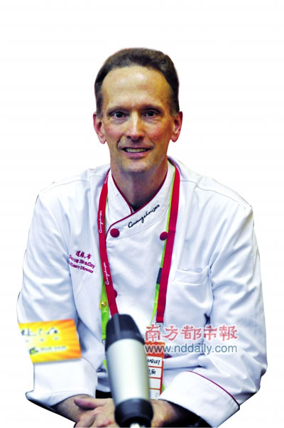 這名身高1 .95米的美國“總廚”,自2008年北京奧運(yùn)會(huì)后便定居中國,去年12月份還把家安在了廣州,喜歡吃燒鵝,也習(xí)慣在飯后喝上一碗雙皮奶當(dāng)甜品!暗 ,中國菜能進(jìn)亞運(yùn)菜單絕不是我一個(gè)人說了算”。