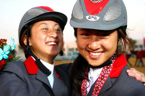 這對21歲的姐妹從9歲起開始騎馬,到現(xiàn)在已經(jīng)12年了。2006年,當(dāng)時(shí)只有17歲的兩姐妹首次代表中華臺北隊(duì)參加多哈亞運(yùn)會,陳少曼奪得場地障礙賽銀牌,陳少喬奪得個(gè)人第4,一時(shí)間蜚聲華人騎術(shù)圈。雖說是出身億萬富豪之家,但兩姐妹沒有半點(diǎn)嬌小姐的樣子。頭盔、白馬褲、馬靴,高挑的身材,兩姐妹在駿馬飛馳的賽場上格外英姿颯爽。