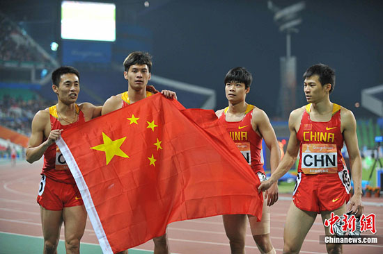 中新網(wǎng)11月26日電 在26日晚結束的廣州亞運會田徑男子4x100米接力決賽中,新科亞洲“百米王”勞義與陸斌、梁嘉鴻和蘇炳添組成的中國隊以38秒78的歷史最好成績奪得冠軍,20年之后再次奪得亞運會接力冠軍。