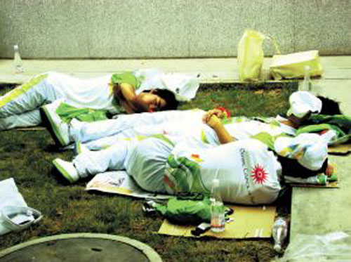 對(duì)一些室外志愿者來說,一天中需要忍受的還包括草坪上吃飯、睡覺……