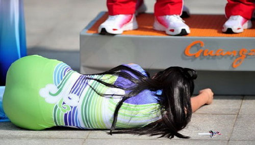 就在“暈倒姐”事件發(fā)生的前兩天,在亞運會射擊比賽的頒獎儀式上,一名叫蘇婉君的禮儀小姐也是托著裝滿獎牌的盤子,累得發(fā)抖,幸被獲得冠軍的外國選手幫忙。據(jù)蘇婉君介紹,那個擺放了鮮花或獎牌的托盤很沉,即使什么東西也不放,分量也是非常重的。
