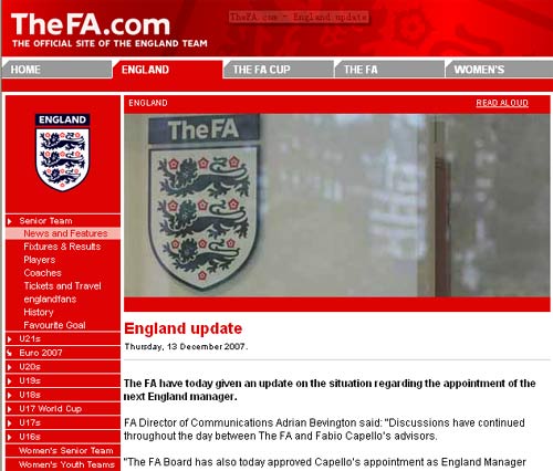 英格蘭足總新聞發(fā)言人貝溫頓表示,“英足總和卡佩羅的顧問已經(jīng)就執(zhí)教問題持續(xù)討論了一天。足總董事會(huì)今天已經(jīng)認(rèn)可了對(duì)于卡佩羅的任命。不過雙方還要繼續(xù)進(jìn)行合同方面的協(xié)商,這些工作將在明天繼續(xù)進(jìn)行。”