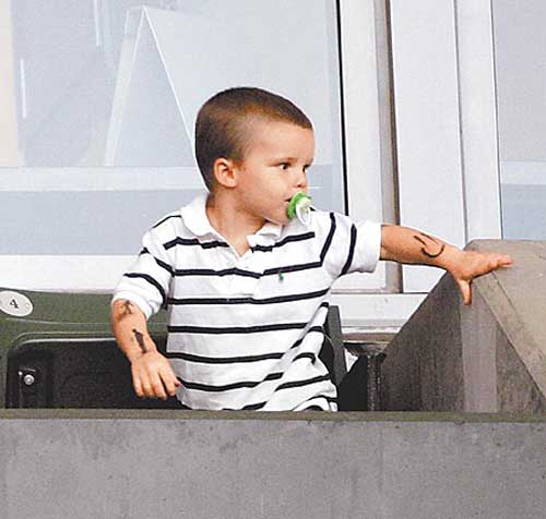 中新網6月10日電 據臺灣媒體報道,足壇“萬人迷”貝克漢姆(David Beckham)是紋身狂,身上至少有12處刺青!坝衅涓副赜衅渥印,小貝愛子克魯茲雖然只有3歲,也在手臂上貼滿了刺青貼紙。英國的《太陽報》形容他是“迷你版貝克漢姆”,但小貝恐怕不能學愛子含奶嘴的可愛樣子。