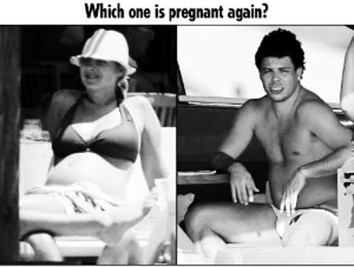 路易斯目前正懷著他和小雷的第2個孩子,挺著肚子大腹便便的躺在海灘上。受傷后身材肥胖嚴重走形的大羅也挺著個大肚子,于是《太陽報》將兩人的照片放在一起比對說:誰看上去更像是懷孕了呢?