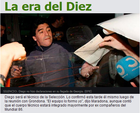 《奧萊報》以“10號的時代”為標題,第一時間發(fā)表了這條消息。阿根廷時間10月28日下午,馬拉多納在和格隆多納面談后確定了自己將成為新的國家隊主教練。他說:“我將自己組建球隊。”同時他還表示,教練組將以他86年世界杯奪冠時的球隊成員為主,甚至當時的冠軍主帥比拉爾多也有可能再度出山,輔佐愛徒。