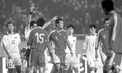 不僅如此,在國足第一個任意球射門出線之后,伊朗主裁以朝鮮隊金永俊提前移動為由,不但給金永俊出示了黃牌,還判任意球重罰。國足第二次也沒打進,此時主裁卻判再次重罰!這次的理由居然是杜震宇罰球時,主裁還沒鳴哨,為此,杜震宇又吃了黃牌,第三次罰球,曲波抽射偏出。如此一波三折的任意球,使得現(xiàn)場球迷也覺得搞笑,一位球迷說:“這個球不但吹得蹊蹺,而且罰了三次真是好!