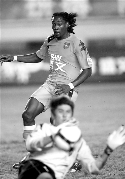 長(zhǎng)春亞泰的作風(fēng)令新帥非常欣慰。圖為青島隊(duì)球員布朗在門(mén)前包抄。
