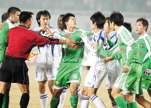 在補(bǔ)時(shí)了長達(dá)7分鐘后,主裁判阿卜杜拉終于吹響了終場結(jié)束的哨音,但裁判的3聲長哨卻變?yōu)椤皼_鋒號”,兩隊(duì)隊(duì)員再次糾纏到一起,最后北京警方不得不進(jìn)入場內(nèi)控制局面,才讓怒火中燒的兩隊(duì)球員返回各自休息室。