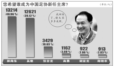 針對(duì)謝亞龍留任的消息,數(shù)萬(wàn)網(wǎng)友在網(wǎng)絡(luò)上展開(kāi)了激烈的討論。昨天,記者在某門戶網(wǎng)站“您認(rèn)為謝亞龍能帶領(lǐng)中國(guó)足球走出困境嗎?”的調(diào)查中(截至昨晚10點(diǎn))看到,短短的一天時(shí)間就有6萬(wàn)多名網(wǎng)友參與了投票,其中97.5%的網(wǎng)友認(rèn)為“不能,之前失敗證明他沒(méi)有這個(gè)能力”。而回帖的網(wǎng)友更是超過(guò)了3萬(wàn),大部分網(wǎng)友都對(duì)謝亞龍的留任表示了不滿,“謝亞龍留任四年內(nèi)不用看足球了!薄熬烤故钦l(shuí)在愚弄我們這些球迷?”而網(wǎng)友小李沒(méi)刀飛更是直接諷刺“龍王”是“國(guó)足最牛釘子戶”。