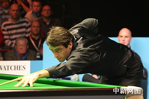 “火箭”奧沙利文在十一日進行的斯諾克英錦賽中,不到兩小時就以九比一大勝對手馬克·金,輕松進入八強。圖為奧沙利文在比賽中。