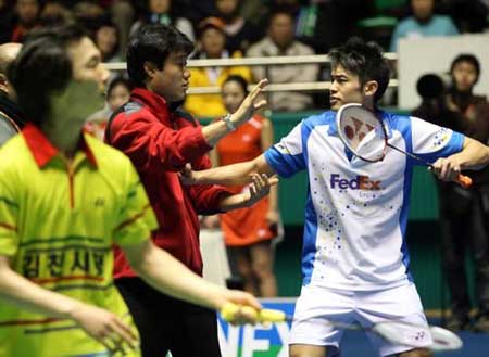 昨天結(jié)束的韓國(guó)羽毛球公開(kāi)賽傳出了不和諧的聲音,中國(guó)隊(duì)男單頭號(hào)種子林丹在決賽中以1比2不敵東道主選手李鉉一,林丹險(xiǎn)些與李鉉一的教練、前中國(guó)男隊(duì)主帥李矛動(dòng)武。他憤怒地把手中的拍子砸向李矛,兩人幾乎要打架,幸虧旁人將他們分開(kāi)。另外,中國(guó)隊(duì)丟掉了女單冠軍,小將盧蘭在決賽中不敵代表中國(guó)香港隊(duì)的前中國(guó)隊(duì)主力周蜜。