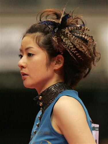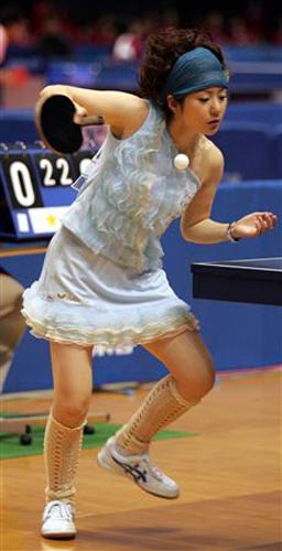 在日本乒壇,福原愛名聲最大,其次就是有著漂亮臉蛋、性感身材的四元奈生美了。今年30歲的四元在日本的影響并不比福原愛低多少。從2007年的全日本乒乓球錦標(biāo)賽至今,這位美女球員每次比賽都會換上不同的時尚超短裙,或是露出香肩的吊帶衫參賽。而且,她的頭飾也都是經(jīng)過發(fā)型師精心設(shè)計的,爆炸式、淑女式……總之,五顏六色的服裝+各類怪異的發(fā)型+比賽場上揮拍動作都是那么的迷人,相比于其他運動員的一臉嚴(yán)肅,四元奈生美在賽場上刮起的時尚之風(fēng)迷倒了很多日本男球迷。