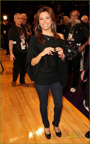 我們的絕望主婦伊娃·朗格利亞看來也是籃球迷啊,在NBA全明星賽的賽場(chǎng)看到了身穿黑色蝙蝠衫的伊娃·朗格利亞,性感的露肩款,配上緊身牛仔褲,高跟鞋,閃亮的大耳環(huán)熠熠生輝,連NBA的球星都爭(zhēng)著和她合影留念。