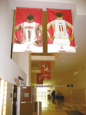 【鏡頭一】從豐田中心正門進(jìn)去,首先進(jìn)入眼簾的,是掛在空中的兩個(gè)巨大背影——姚明和麥迪,遠(yuǎn)處是威爾斯和阿爾斯通。(下左圖)
