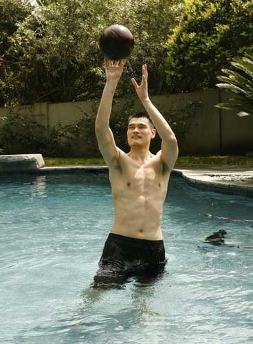 對于“水療”這種特殊的體能恢復(fù)方式,姚明也是樂在其中。泳池內(nèi)光著膀子的姚明顯得格外高興。