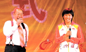 何賽飛的話顯然啟發(fā)了楊秀麗,在記者的“慫恿”下,她向協(xié)辦此次畫展的中體明星隊(duì)領(lǐng)隊(duì)王奇說了自己的想法。王奇立即將楊秀麗送上了臺(tái)并和主持活動(dòng)的崔永元偷偷交代!岸祭蠋煟埩舨!贝抻涝獙l(fā)言完畢的都本基留在臺(tái)上,“奧運(yùn)冠軍楊秀麗希望能拜您為師學(xué)習(xí)書法!边@是個(gè)意外安排,都本基大師顯得非常激動(dòng)!斑@個(gè)徒弟我收下了!”老人的干脆讓楊秀麗有些驚訝,她深深地向老師鞠了一躬,頭上的汗水晶瑩可見!拔业膵屟剑o張死了,從沒這么緊張過!苯K于如愿的楊秀麗抹了一把汗說,“這下我回去更要好好練字了!