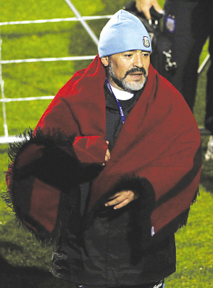 當(dāng)阿根廷隊剛剛結(jié)束訓(xùn)練,馬拉多納一行正要返回更衣室,這時兩個來自薩爾塔市(布宜諾斯艾利斯以北的小城)的阿根廷記者走了過來向老馬講述了他們長途跋涉帶來禮物和祝福的故事,馬拉多納本來是快步走向更衣室的,聽到記者的故事立刻停了下來!斑@是來自San Antonio de Los Cobres,一個海拔4000米小城孩子們的禮物,他們托我們?yōu)槟銕砹颂鹤印!甭牭竭@里馬拉多納的真性情顯露無遺,接過毯子立刻披在了身上。這個被提到的小城叫做 San Antonio de los Cobres,距薩爾塔市約180公里,距布宜諾斯艾利斯約1750公里,海拔高達4000米,那里的球迷無法通過電視來觀看世界杯的比賽,但是他們一樣喜歡馬拉多納,關(guān)注阿根廷隊。許凱 黃啟元 本報南非專電