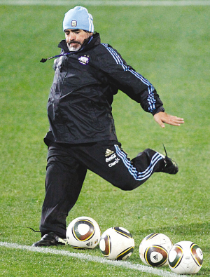 300名記者,上百支“長槍短炮”,密密麻麻擠滿了訓(xùn)練球場的看臺。沒有梅西、伊瓜因,阿根廷人的訓(xùn)練并不寂寞。只因為一個人的存在,馬拉多納。沒有任何懸念,所有的風(fēng)頭,都被老馬一人搶光。