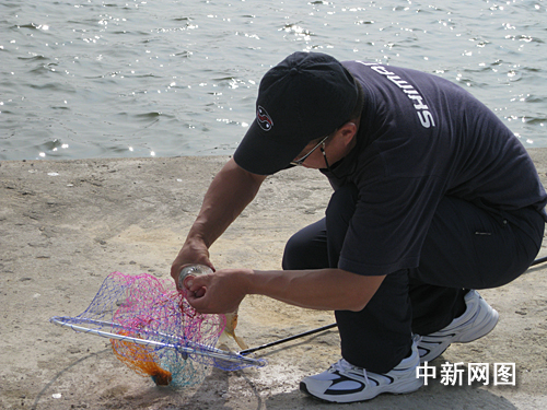 有一名來自安徽的選手顯然是這路“武功”里的豪放派。當(dāng)魚急著四處游走想擺脫魚鉤的束縛時(shí),這位“大俠”卻好整以暇地以單手控竿,巧妙地跟著魚的力量調(diào)整好釣線的角度,最后猛地使出一個(gè)“拔蔥式”——一條大魚頓時(shí)從水里“一飛沖天”,頗為委屈地重重拍在了地上。